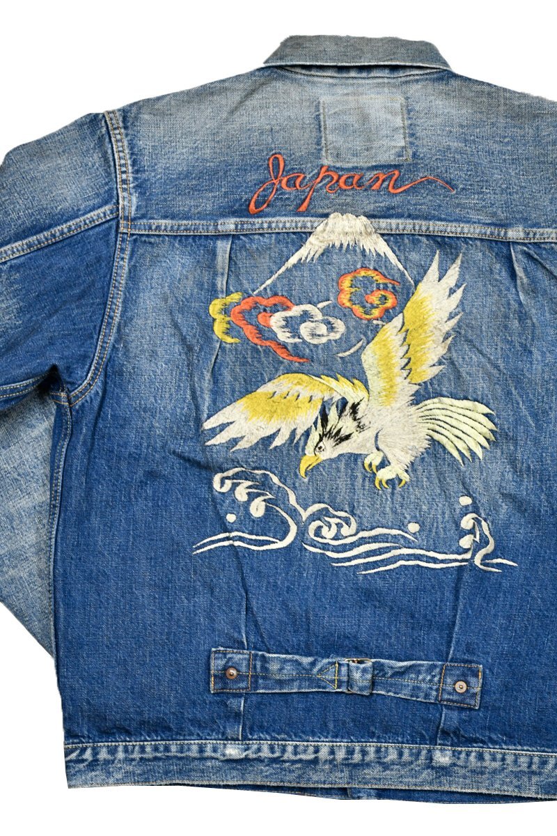 定番の2107 Type 1ジャケットに鷹と富士山の刺繍を施したデニムジャケットタイプのスカジャンに(More Than Real)を施した中古加工バージョン。