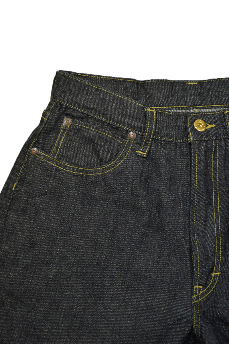 フロントは真鍮ボタンとカムロック式Gripper Zipperを採用し、縫製には綿糸を使用。腿まわりに程よいゆとりを残しつつ、裾にかけて自然にテーパードさせたオリジナルシルエットに仕上げています。